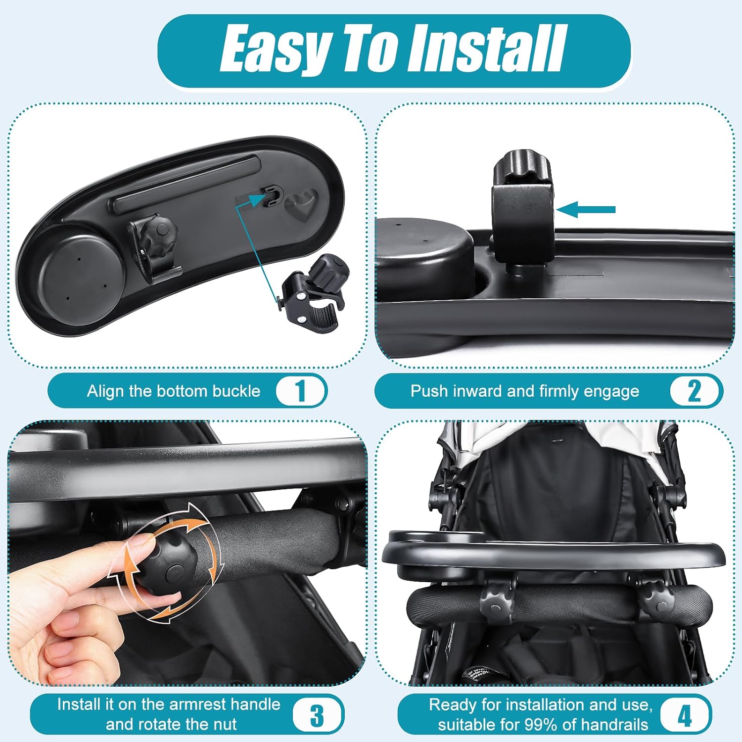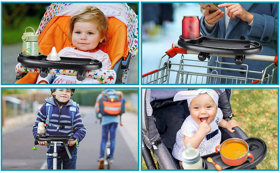 Multi Functional Snack Tray: - Upgraded 3 in 1 stroller snack tray, includes snack tray drink holder and phone holder. Snack tray can hold baby's toys or food; Cup holder can hold baby's water cup or bottle; Phone holder can hold videos that babies like(special circumstances to soothe the baby use)